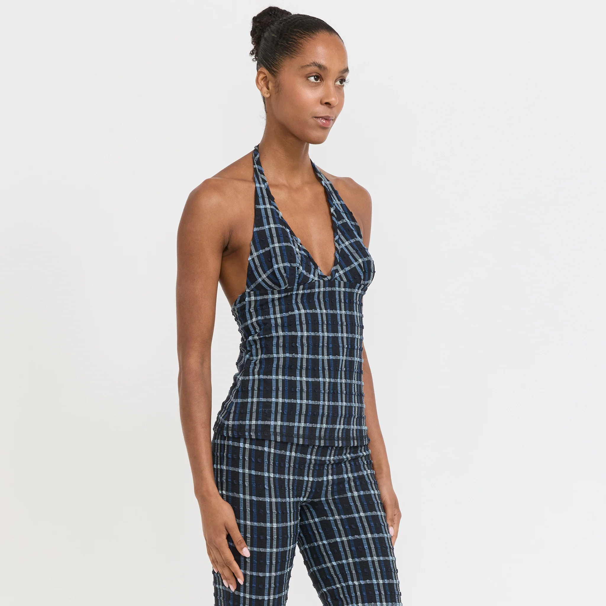 The Cindy Halter from Permanent Vacation is a form fitting halter style crafted from a recycled blend seersucker.