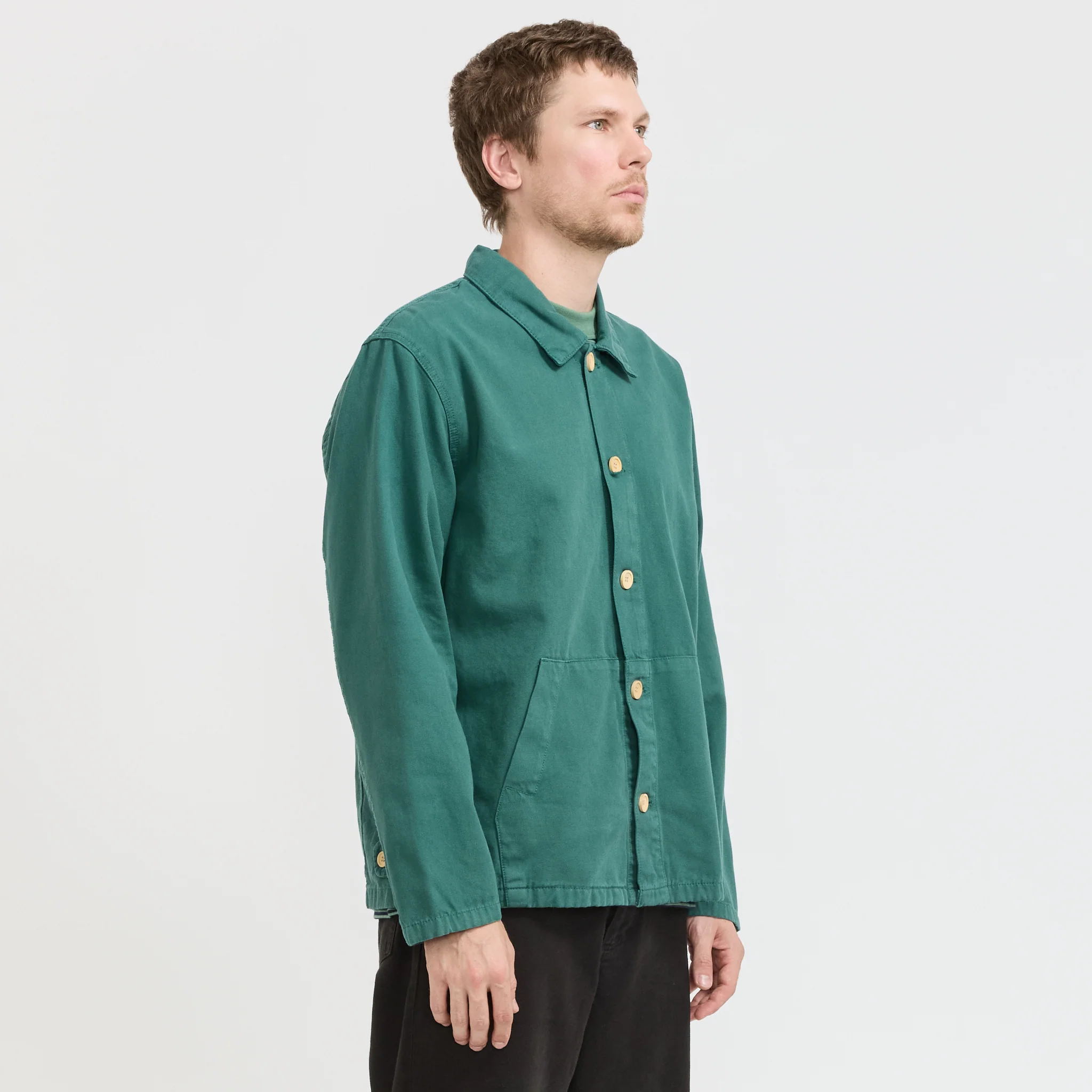 A simple canvas chore coat from the Armor Lux Heritage range. The mid weight cotton canvas has bee garment washed for a softened tone and perfect comfort from the first wear. Featuring a full-length button placket, long sleeves with set-in seams and button-adjustable cuffs.