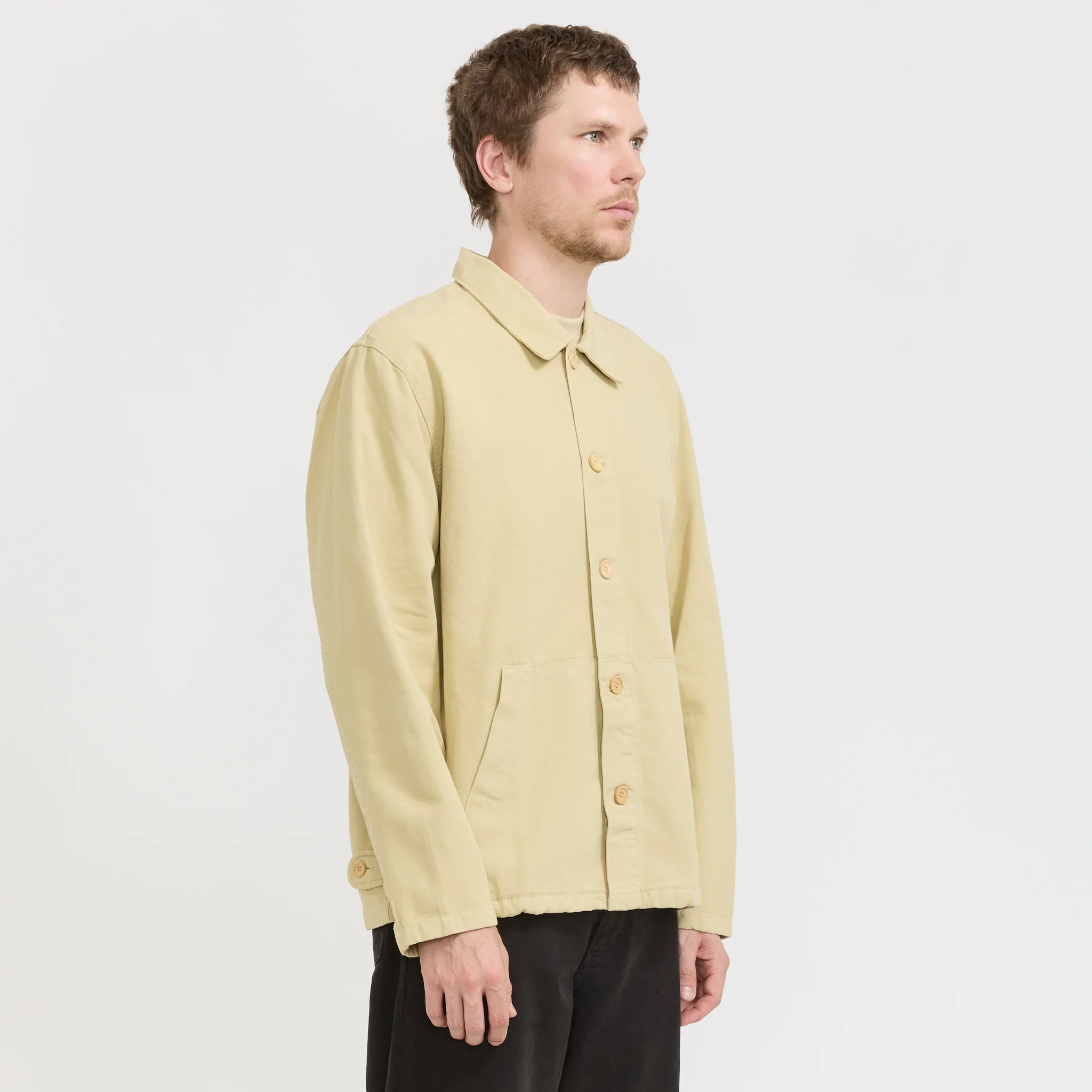 A simple canvas chore coat from the Armor Lux Heritage range. The mid weight cotton canvas has bee garment washed for a softened tone and perfect comfort from the first wear. Featuring a full-length button placket, long sleeves with set-in seams and button-adjustable cuffs.