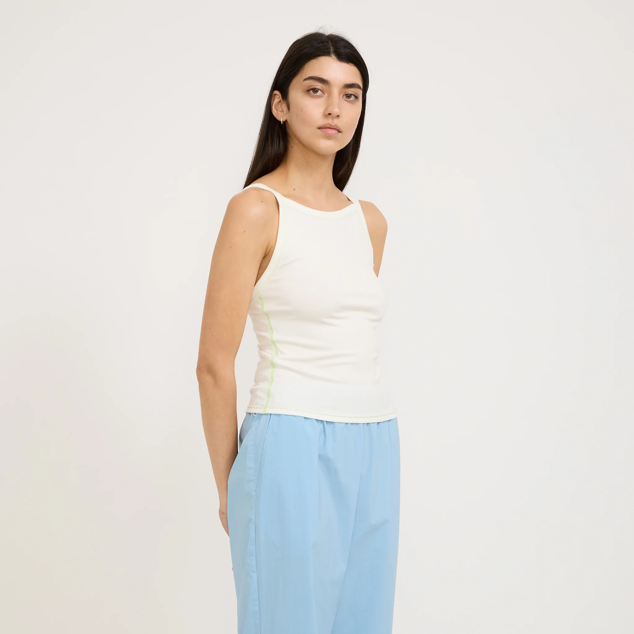 The Imitation Singlet in Chalk from Melbourne based label Permanent Vacation is a form fitting elevated basic cut from a super soft sandwashed modal blend with a flattering low back and contrast white stitching.