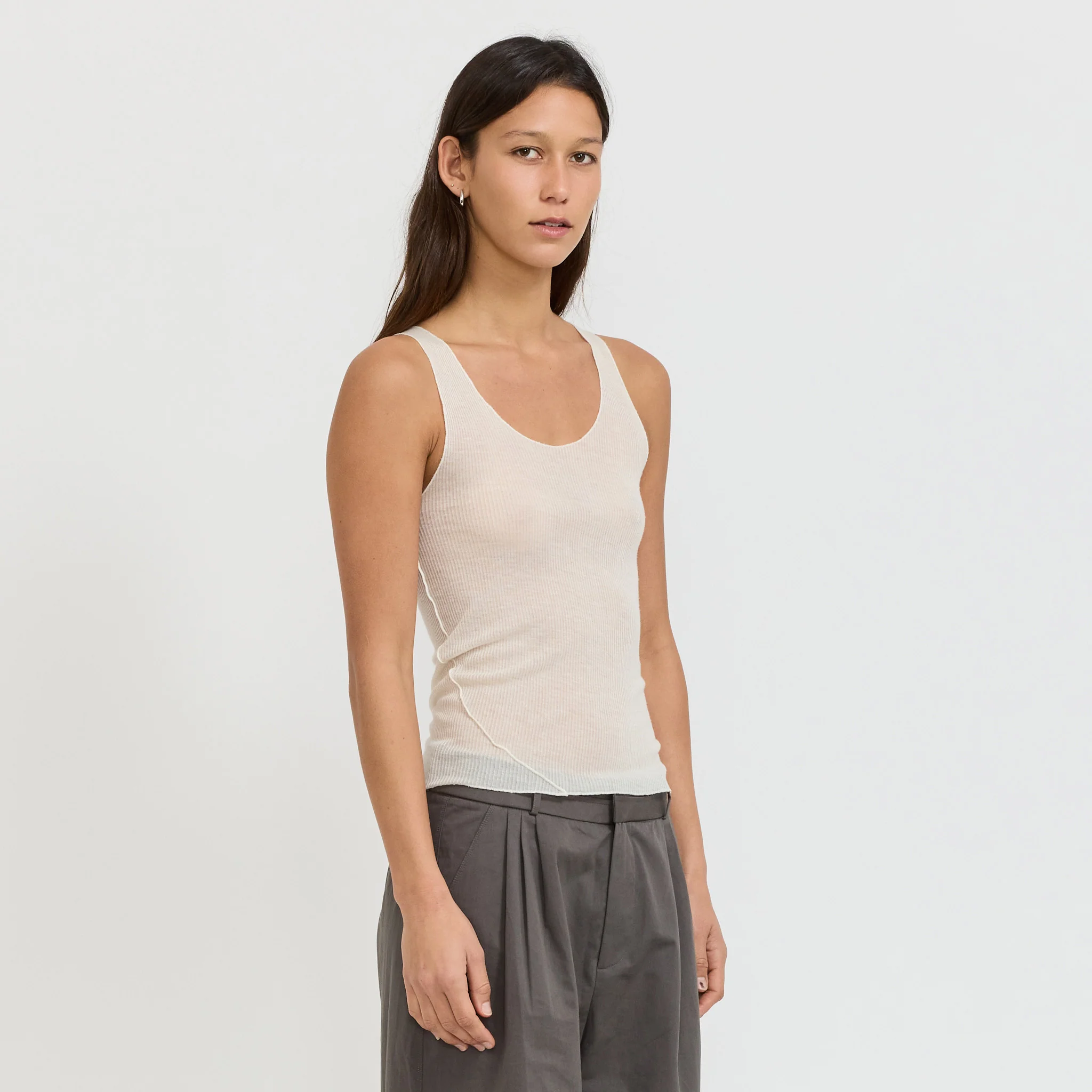 The sheer fine Knit Tank in Off White from Deiji Studios features a low curved neckline, racer back, asymmetric side seam detail and a baby lock finish on edges in a slim fitting silhouette.