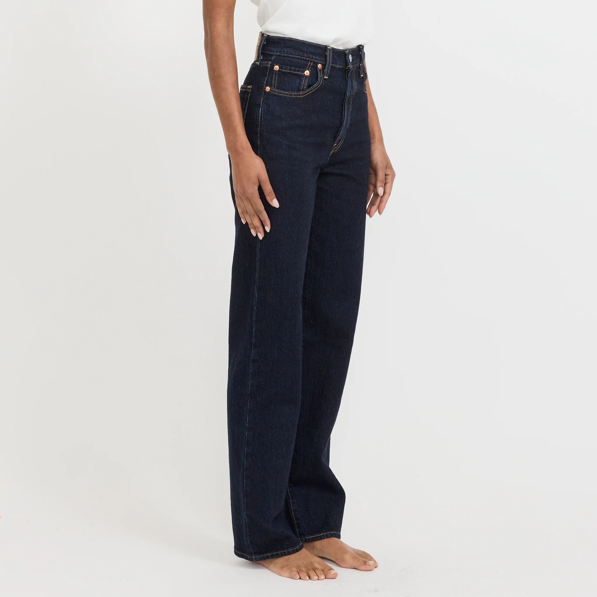 The Ribcage is Levis highest high rise jean, slim through the hip and thigh continuing into a full length, straight leg. The Small Course is a deep and rich indigo wash.