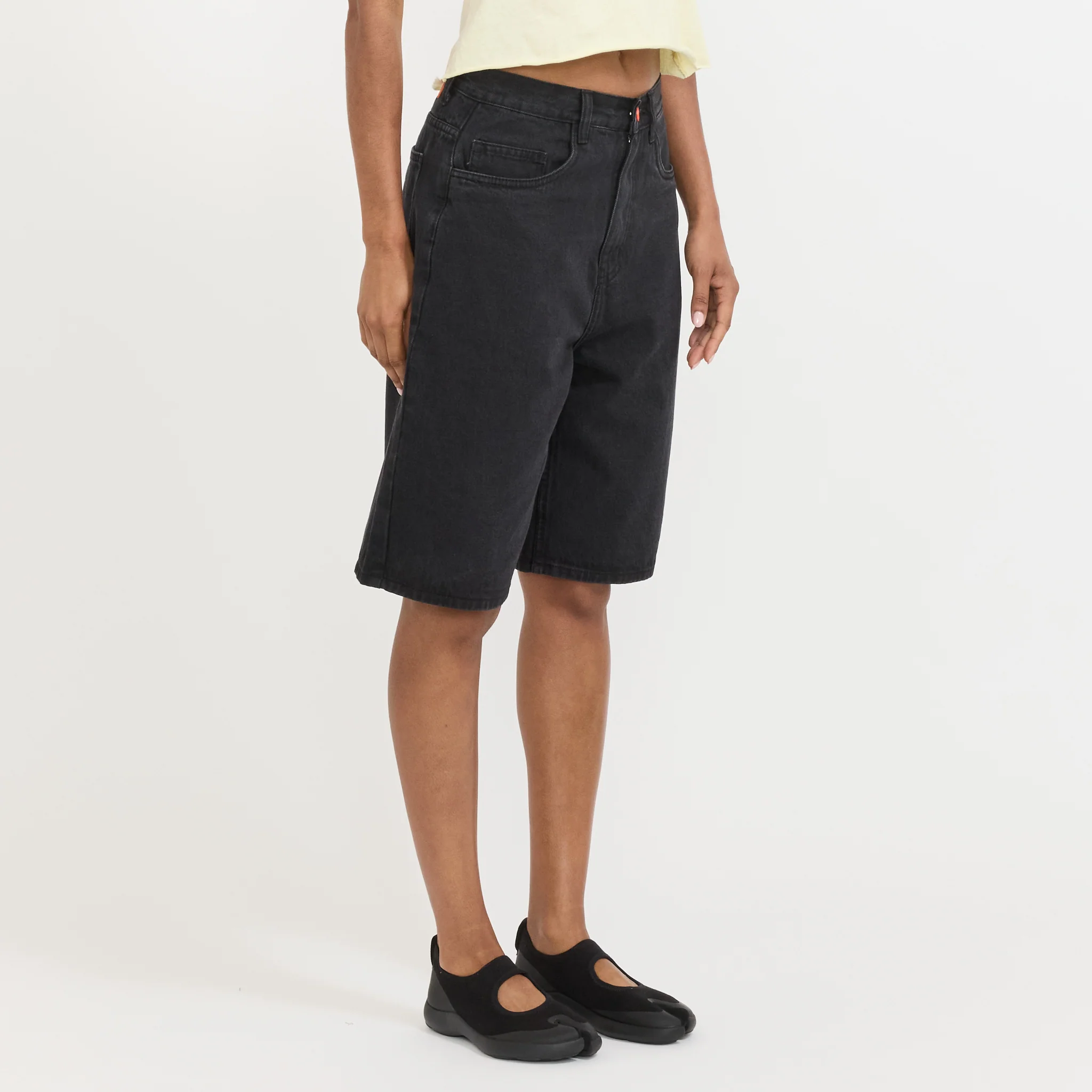 Loose fitting short in 90's inspired black denim with tonal stitching and BeWider rubber logo patch and orange button.