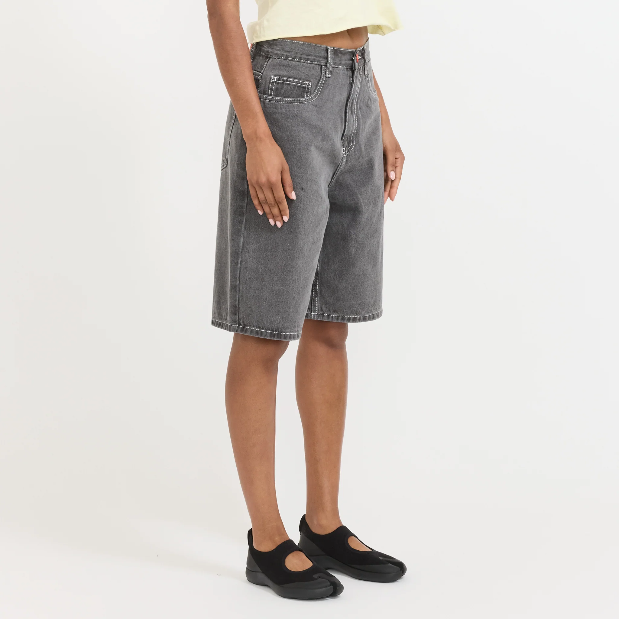 Loose fitting short in 90's inspired washed grey denim with tonal stitching and BeWider rubber logo patch and orange button.